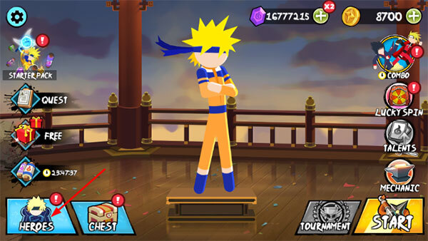 1、首先打开火柴人忍者大战最新版,点击左下角在heroes;