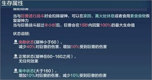 5、前期我们装备成型后,与巨兽战斗时会持续扣除凝神。当凝神低于60,对巨兽的伤害会减少40%,受到巨兽的伤害则增加10%。当凝神大于160,对巨兽的伤害会增加10%。因此,要多留意自己的凝神状态,通过食用素食或在家园、营地休息,可恢复凝神。