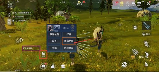 两位旅者见面之后,会出现一个附近标志。在附近列表中选择你要与之交易的旅者ID,并选择申请交易。