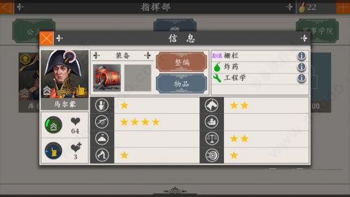 2、可以在指挥部中点击将军头像右上角的叹号就可以看到将军的信息,这里有两个选项一个是整编,一个是物品。
