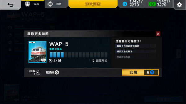 3、若要解锁火车蓝图,需使用带有蓝色“G”字样的钻石货币。点击交易,通常需交易十几到二十次方可解锁。