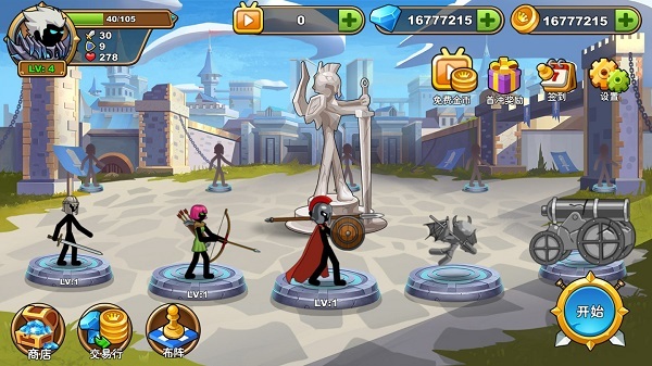 挑选你心仪的剑、枪、狙击步枪、猎枪、手枪、弓、斧以及众多武器,化身火柴人角斗士或者火柴人弓箭手。