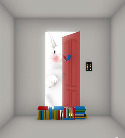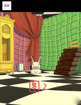 拿完钥匙后,来到图四。那本巨大的书的左下角有个黄色的门,先用闹钟吵醒把手再打开门。开门之后就是找兔子的游戏。