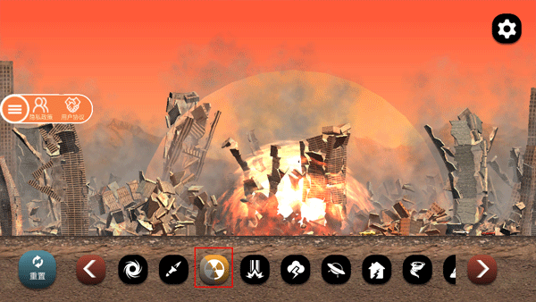 4、中间的多个功能按键代表着破坏城市的不同方式。以类似雷达的图标为例,点击该按钮后,再点击城市,就会有陨石坠落到这座城市,把城市里所有的建筑都毁掉。