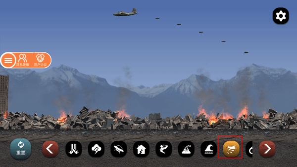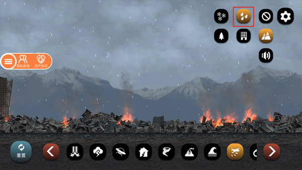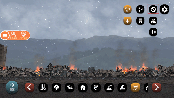 7、倘若城市已被破坏得面目全非,你还能够降下些雨或雪来降降温。要是想关闭天气效果,直接点击右侧带有斜杠的图标就行。