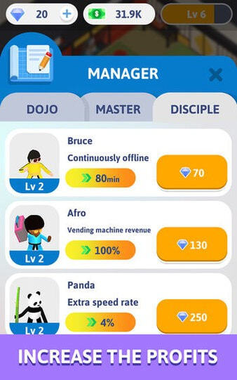 升级你的武馆,开设分布,不断的购买更多顶级的武功装备,让它四处都是;