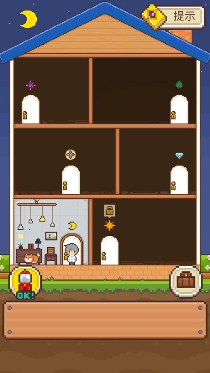 1、月亮房间:完成前期剧情后,主角在一个陌生房间苏醒。一开始会有游戏玩法的介绍。接着观察墙面,拿起挂在墙上的月亮钥匙,用它打开月亮门。别忘了拿走桌上的攻略书,这很有用!之后点击调查墙上的黄色纸片,能看到图形顺序,再次点击纸片,会出现数字213 ,由此可推断出密码为□。找到桌上的盒子,按照方块、圆圈、音符的顺序操作,就能获得下一个四色宝石房间的钥匙。