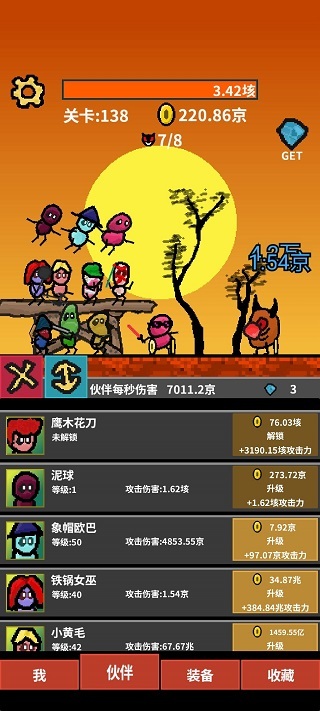 2、在角色伤害方面,小编主要提升主角的暴击率,装备大多选择增加暴击伤害的。至于伙伴是否暴击不太清楚,但主角肯定能打出暴击。通过堆叠点击伤害,就能轻松造成高额伤害。
