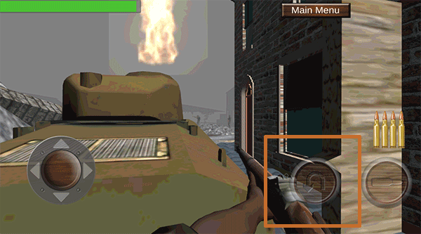 进入游戏后,我们会跟随一支小部队抵达战场。当馒头坦克被击毁、队友纷纷倒下,就该我们大显身手了。需留意的是,游戏里子弹不会自动上膛,玩家得自行操作,点击红色方框内的按钮来完成上膛。