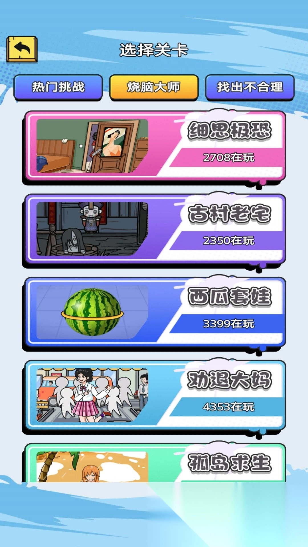 找茬高手在此,为你呈上海量趣味关卡,带你体验休闲娱乐风格的烧脑解谜闯关挑战。这里有三种别具一格的模式,分别是热门挑战、烧脑大师以及找出不合理。每种模式都包含超多诙谐有趣的找茬解谜关卡,快准备好开动脑筋,来试试挑战吧!