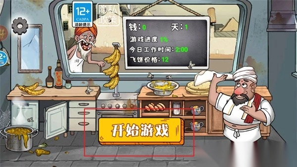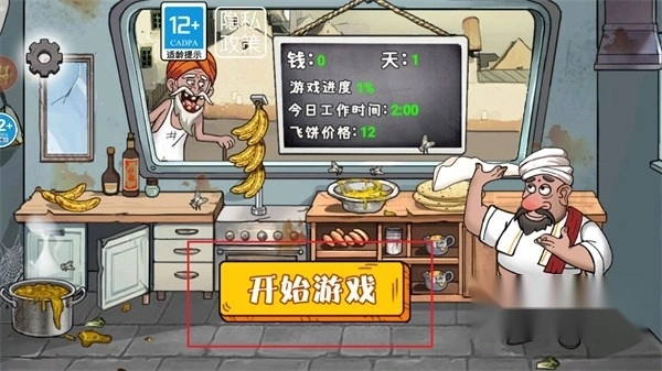 1、进入到游戏的场景内之后,玩家首先需要点击屏幕之中的【开始游戏】按钮,以正式的开启煎饼的贩卖之旅;