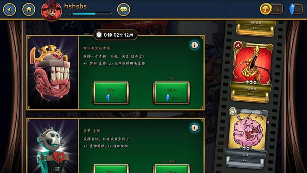 2、圣物:进入圣物页面后玩家可以在这里购买到不同等级的生物宝箱,圣物宝箱一共分为五类但是只有两种宝箱是可以购买的,其他的宝箱需要玩家去收集碎片或者等待开启时间才可以获得。