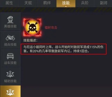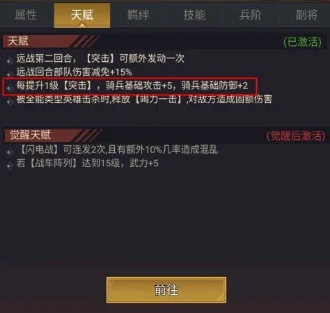 天赋:每位英雄都具备独特的天赋技能,在此需关注英雄的天赋与固定技能之间是否存在加成效果。以末日邮差为例,每当【突击】提升1级,骑兵的基础攻击就会增加5,基础防御增加2 。