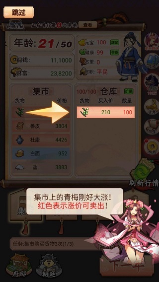 如:集市上的青梅刚好大涨!红色则表示涨价可卖出!