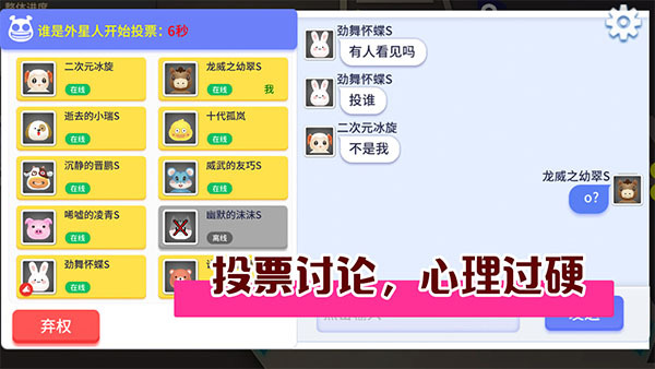 3、充满紧张刺激感的对局模式,在此模式中,外星人需设法隐瞒事件真相,而小动物们的任务是准确揪出真正的凶手。