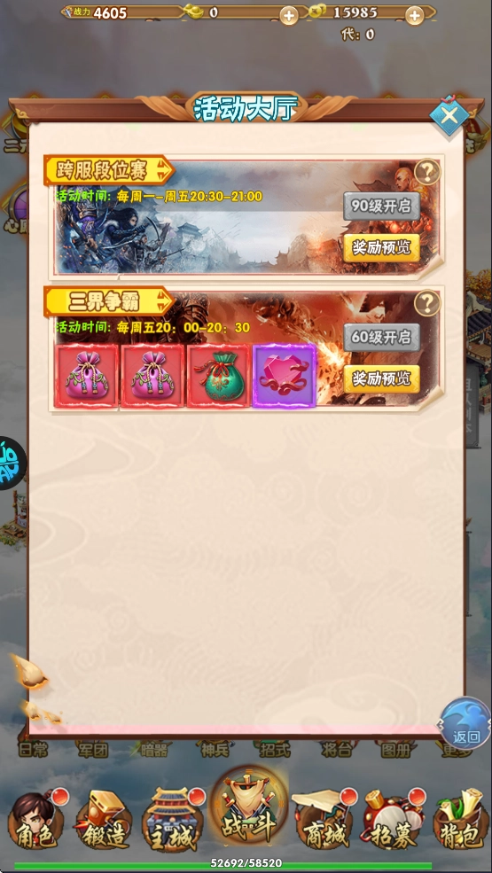 1、三国争霸活动时间:每周五晚上20:00-20:30