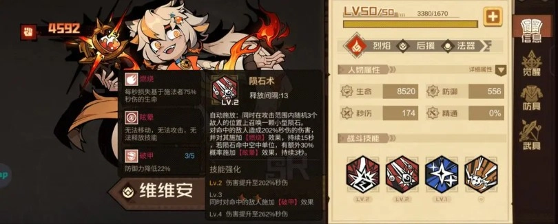 维维安定位是副c,帮沙拉曼挂燃烧,频繁释放自动技能触发沙拉曼被动同时打一些伤害,并且非常契合天罚之日。