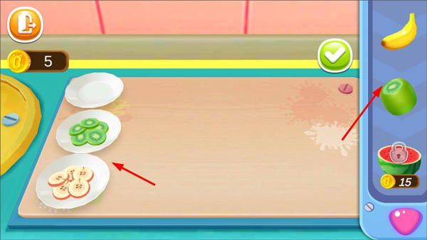 3、在雪糕添加果酱后,玩家需切一些水果放入其中,点击右侧水果放置到案板上就行。