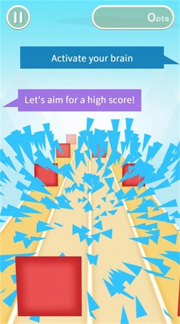3、控制双球避开道路两侧红色方块,吃到蓝色三角得分,右上角显示当前分数。