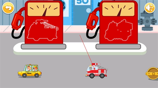 2、在场景中,观察出现的汽车,将其拖动到对应的红色加油机旁,加油机上有汽车轮廓图案。