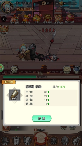 1. 进入游戏后,点击屏幕下方的战鼓,获取装备并穿戴。