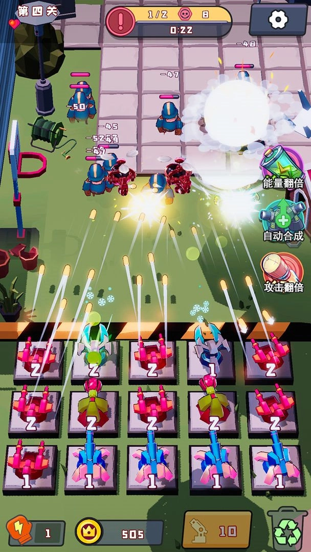 2、炮塔合成:将低级炮塔合成升级,提升火力。