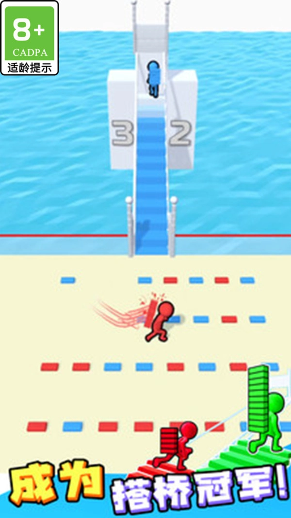 2.玩家通过收集绿色和紫色的积木,迅速建造桥梁,并确保自己的桥梁足够稳固,不被其他竞争者赶超。