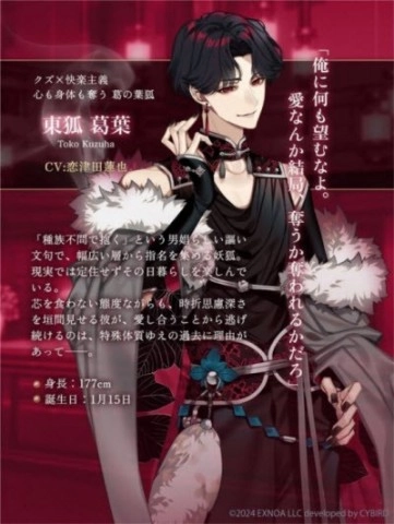 东狐葛叶(とうこ くずは)由恋津田莲也配音。温柔又隐含狡黠的声音,完美地诠释了他这一角色的特性。