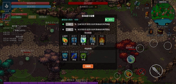 2、然后点击右上方的自动战斗按钮,设置好相关的自动恢复和自动施法功能,点击下方已禁用按钮即可开始自动刷怪。