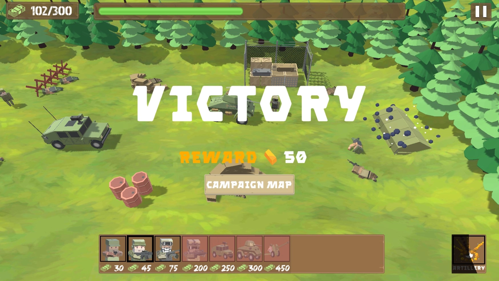 随着您取得更多胜利,您可以使用狙击手、咕噜声、吉普车、坦克和大炮升级您的军队和士兵。