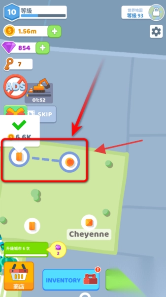 2、选择待开发区域,按指引连接两个节点(如虚线连接),完成区域开发,解锁新建筑与收益。