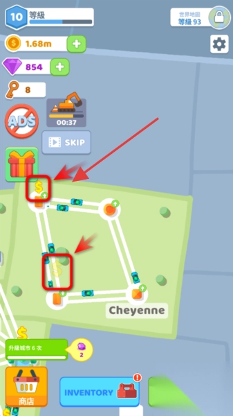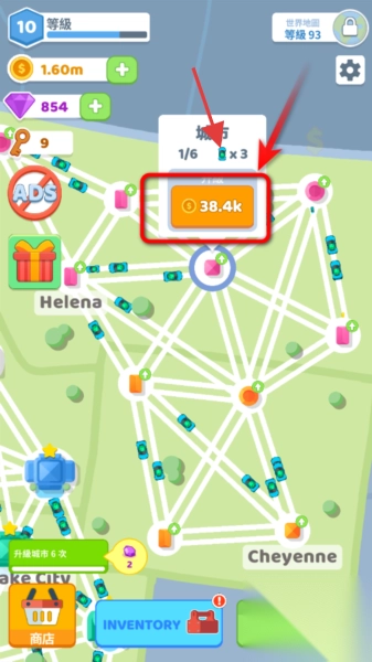 1. 在世界地图上,点击那些显示有“38.4k”这类收益标识的区域,然后连接城市节点,如此便可获取金币资源,进而推动城市建设。