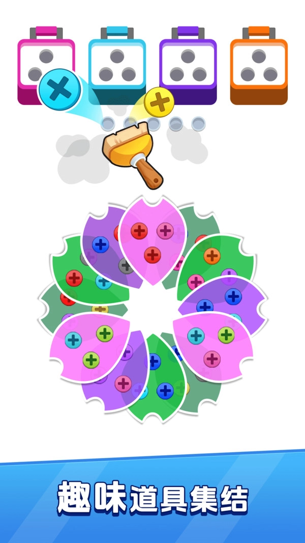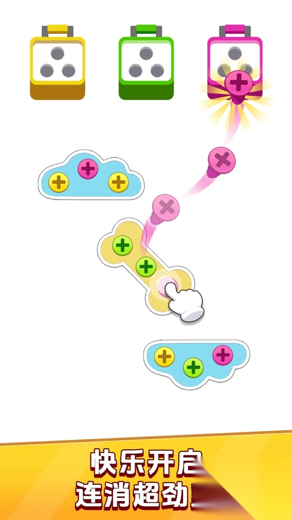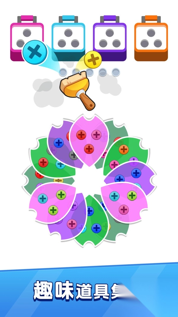 2、根据游戏提示,收集相同颜色的螺丝放入对应的螺丝盒,完成装配即可通关;