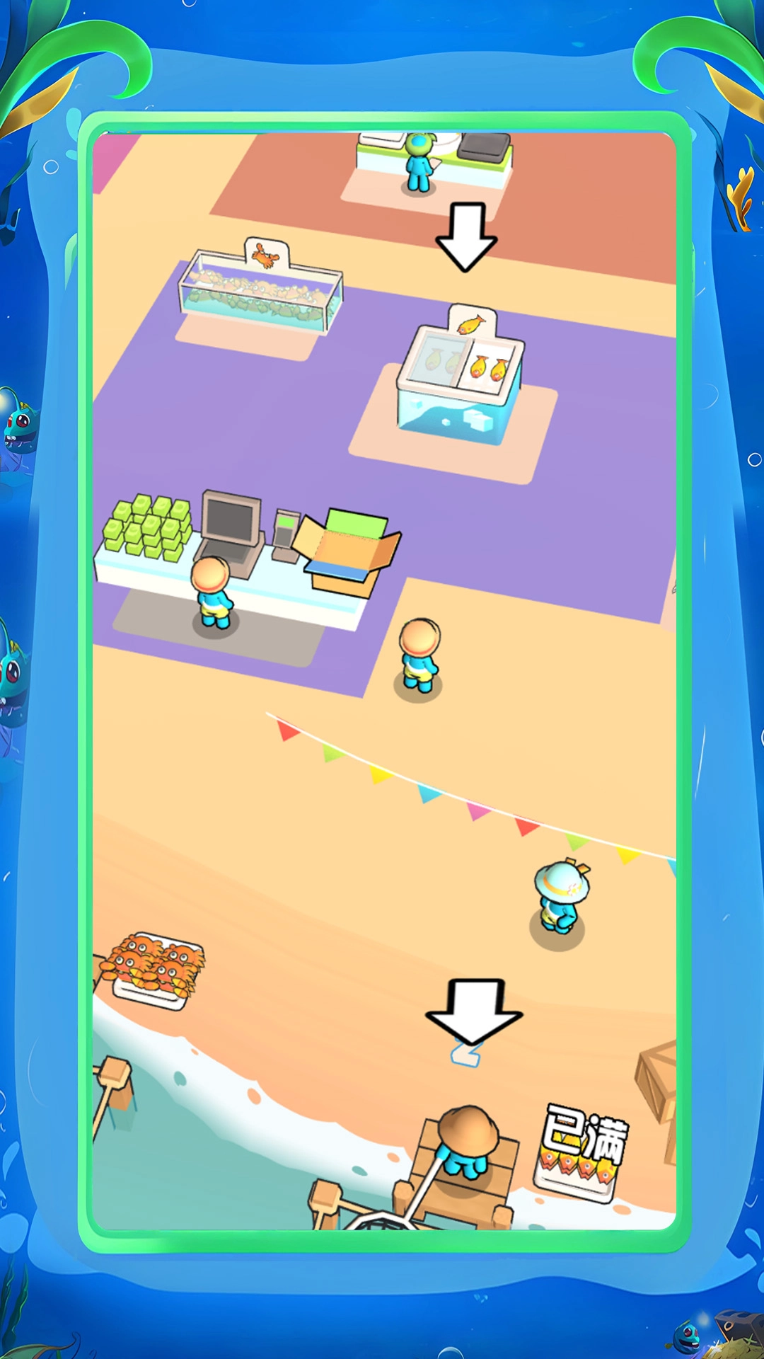 1、顾客会来到鱼店购买鱼,玩家需要及时为顾客提供服务,让美味客人都能买到高质量鱼。
