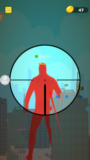 1、进入关卡,用狙击枪瞄准红色巨人带皇冠,界面显示金币47,左上角有重玩、隐私按钮。