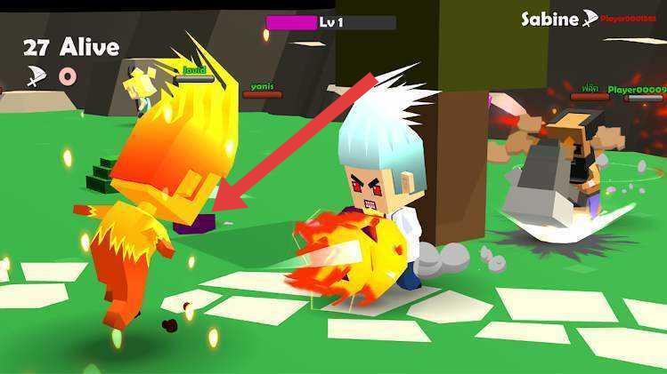 2、战斗中,操控火焰角色(箭头指向),攻击敌方角色(如白头发对手),利用技能和武器,淘汰敌人。