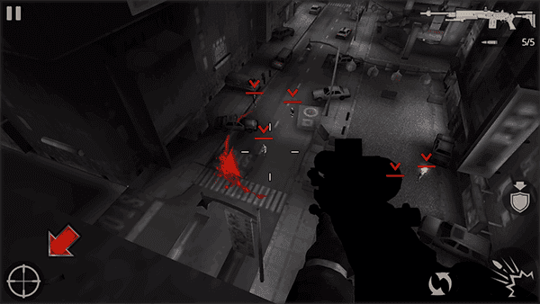 1. 成功安装杀手2影子阴谋手机版后,游戏开启时我们会置身于天台上,且处于掩护状态。轻点右侧的盾牌箭头图标,主角就会起身脱离掩护。 2. 此时能发现下方敌人数量不少,点击左下角的瞄准按钮。