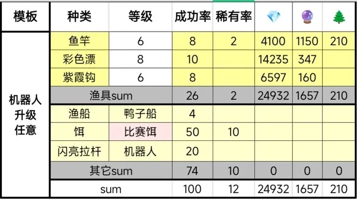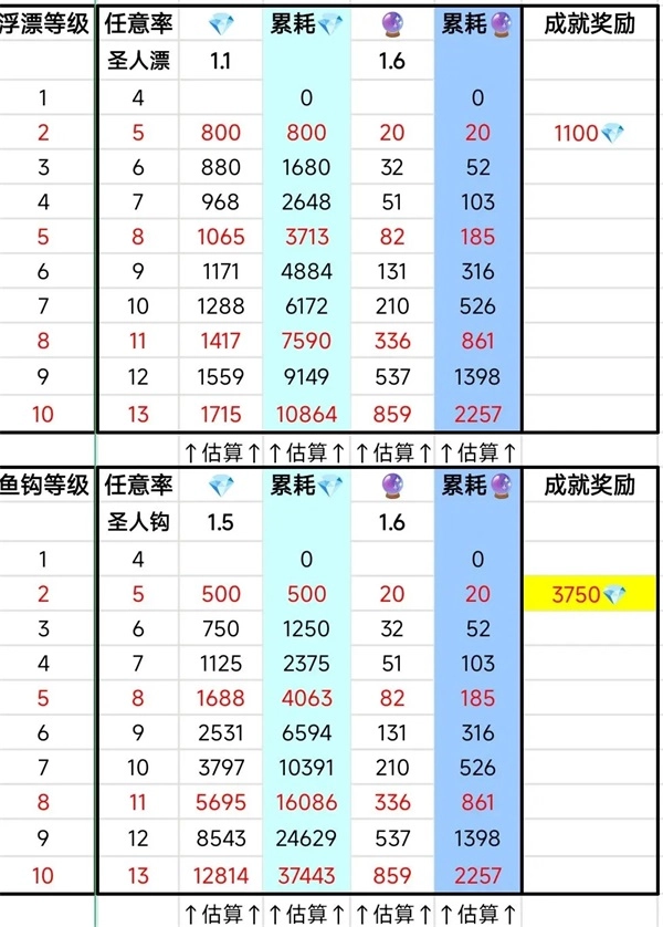 一、按照下图(根据自己氪没氪船来选)升级渔具。水手之心?不足的,可以用钻买月卡2,最多74天(如果已经升级过鱼竿和任意size鱼漂钩,完全可以更少天数)(每天点蓝恐龙出吉姆必给且仅给1?,超馆礼包在?钓鱼界面每天领5个,加上月卡2的20个,总共每天26个?)。然后用比赛饵,机器人/手动都可,做100连杆成就。
