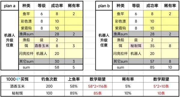 因为玉米饵5?,秘制饵10?,这样花同样价格,玉米饵可以钓鱼的次数是秘制饵的两倍~!数学期望也会翻倍。所以渔具越好,玉米饵越划算。理论具体可见图~而实际实验数据,也是同样价格下,玉米饵的鱼换取的功德更高