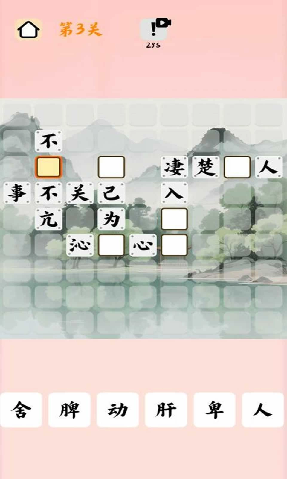 2、理解题意与备选字,仔细观察横向和纵向的成语提示,并从界面下方提供的备选汉字中寻找可能匹配的字。