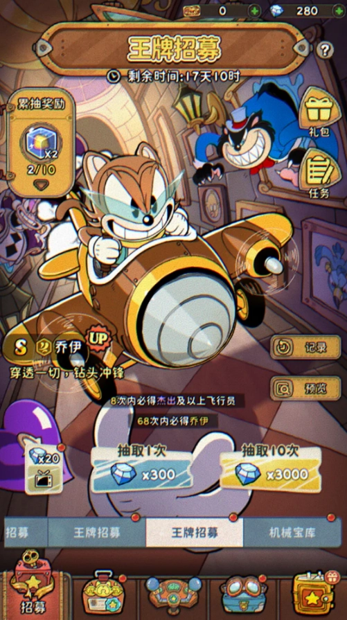 v1.3.71.3111版本 《发条总动员》现已全平台上线!现在狂发100抽福利,机长快人一步冲上云霄!8大福利上线即领,咔咔就是发!来玩发条总动员,直接血赚3000+,还能白嫖王牌飞行员——查理。这一次,我们还将「奶酪争夺战」搬上天空,《发条总动员》×《猫和老鼠》联动今日同步上线!