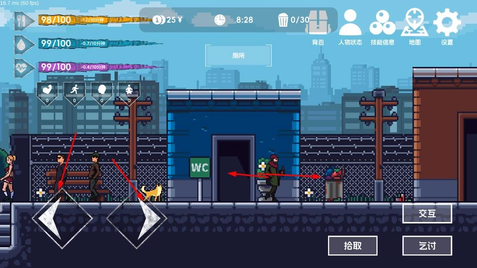 1. 控制角色向左或向右移动,在场景里与诸如WC标识所在位置等地点展开交互,也能够运用拾取乞讨功能,与此同时关注人物的饥饿、水分、健康等状态条。