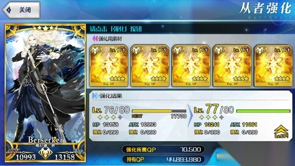 4、同时由于星级越高的从者强化时所消耗的QP越高,所以一些较低星级的狗粮不适合用于高星级从者的强化,否则前期有限的QP会显得十分吃紧,因此建议在50级以上的五星英灵不使用四星以下的狗粮进行强化。