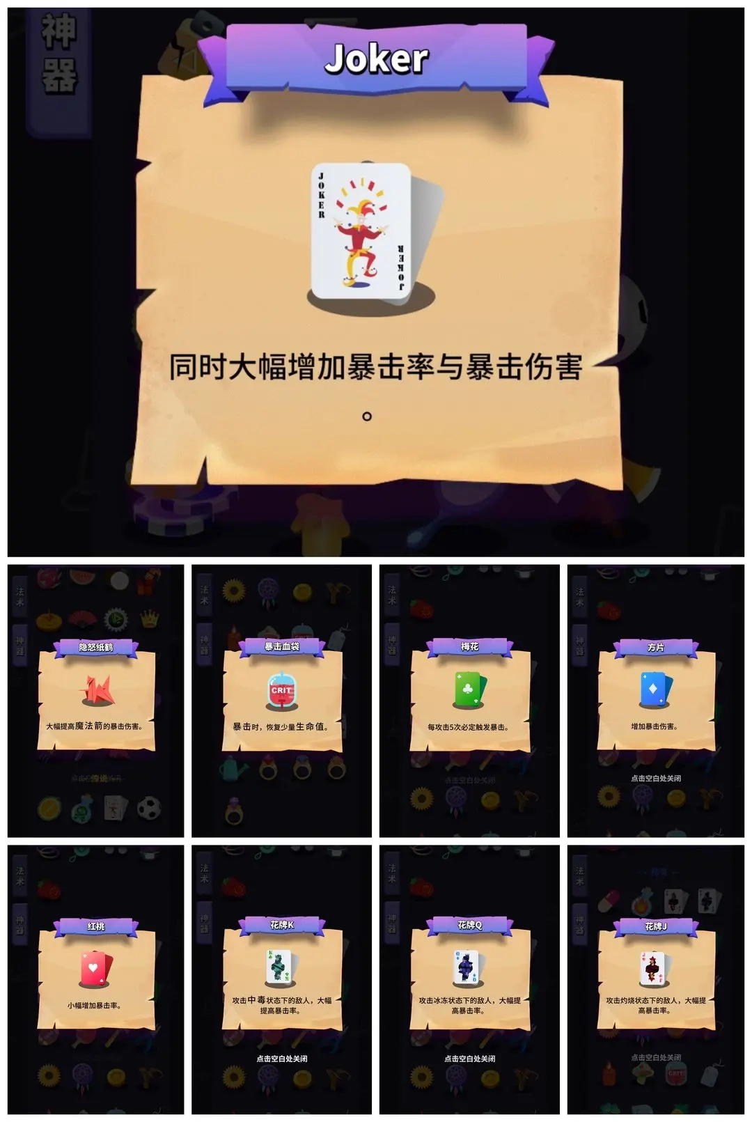 首先暴击率法术卡,红牌,蓝牌,千纸鹤都属于那种朴实无华地增加我们的暴击爆伤的,属于见到就拿的。joker也是平A流的绝对顶梁柱,不可或缺的存在。但是这个时候我们距离满爆可能还差一点,这就需要花牌来帮助我们了,在三种花牌中我推荐毒花牌作为我们的增加暴击率手段,因为冰冻这个状态比较难触发,而且时间太短,烧伤同理,所以冰火花牌可以排除。至于上毒的道具我推荐以下几个: