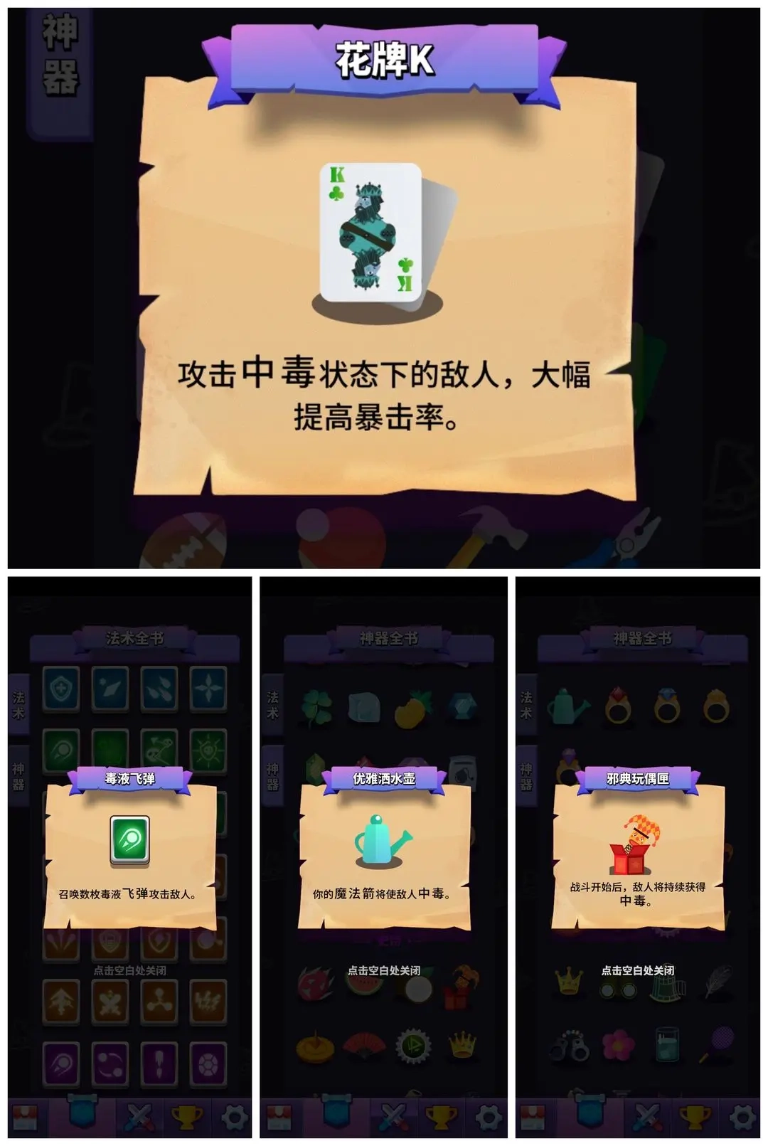其中玩偶匣优先级最高,可以做到进图毒全屏,你不死毒不灭。是花牌K最好的伙伴,当然要是没有的话也可以用洒水壶代替,缺点就是你A怪的第一下没有花牌的暴击率加成,这就有可能是清小怪时A一下和A两下的区别。最后要是连洒水壶都没有的话可以用毒系法术,啥都行,能上毒就行,看你自己喜欢哪个了,推荐毒飞弹。