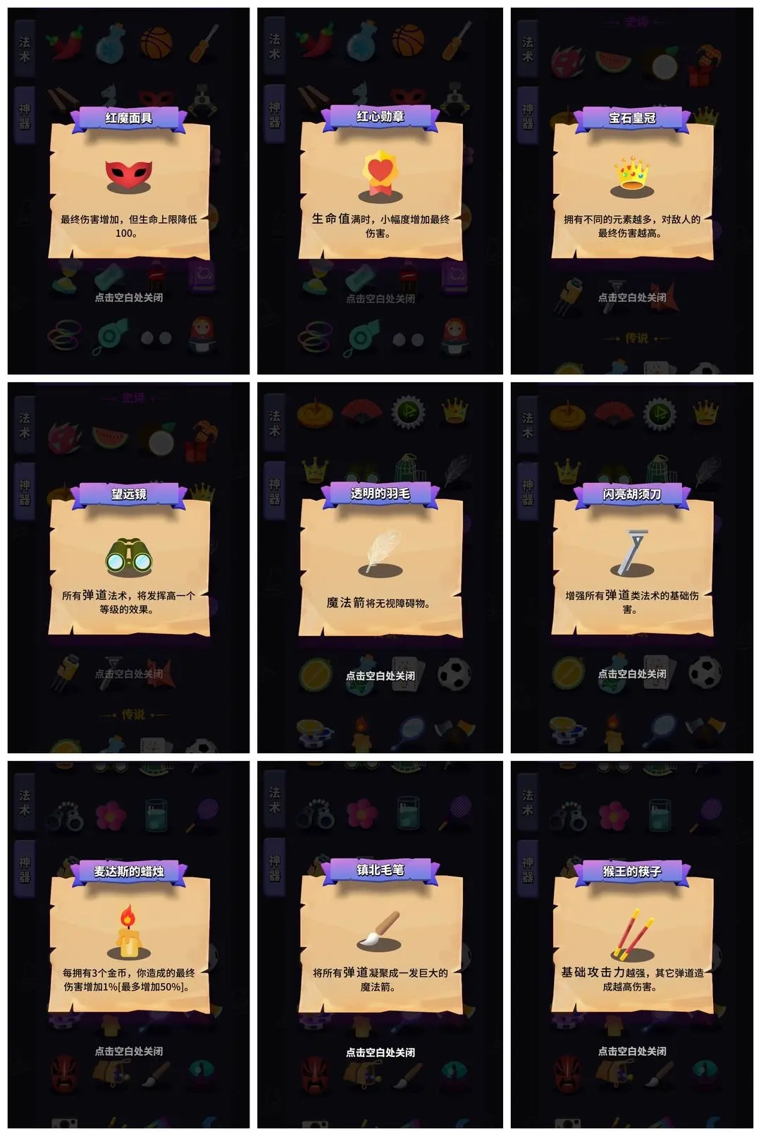 接下来说望远镜和羽毛,这两个都不是直接加伤害的神器,但是在平A流中也有其独特地位,首先是望远镜,我觉得它完全可以称得上是平A流崛起的中流砥柱,所有弹道法术升1级,上限2级。所以前期只要弹道流各种法术1级就够,其他直接拿9金币,中期拿望远镜,直接全2级,美滋滋。省下来的钱可以买别的神器,可以吃利息,可以攒到最后用筹码翻倍刷分,可以说好用到爆。羽毛的话在前期有些boss战和特殊关卡能发挥出很大的作用,后期流派成型了则用处较小。可以酌情拿取。