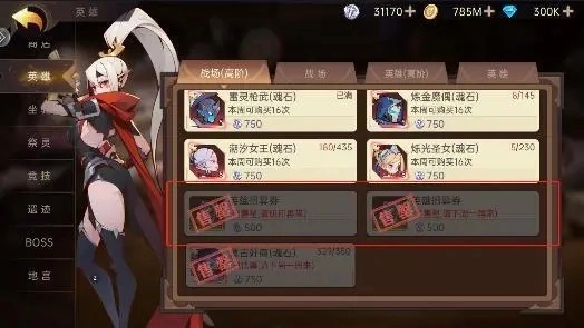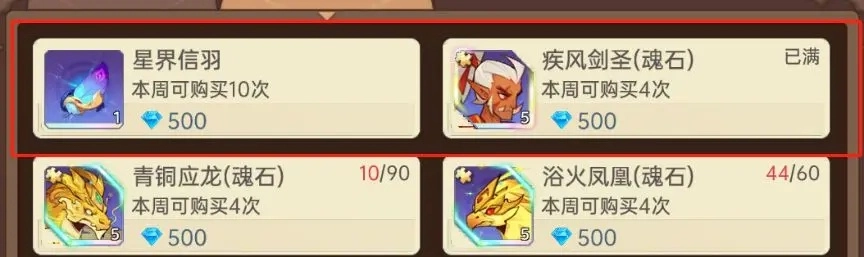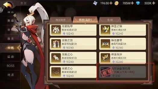 同时,在竞技、BOSS与遗迹商店中会提供随机宝箱,每周都要买满,开出高级资源对前期战力提升十分巨大,但是要注意,跨服竞技中的资源不要购买随机宝箱,要购买专武的洗练与灌注资源。我框选了一些必买资源,大家根据自己的代币情况进行购买。