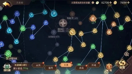 以上就是游戏核心养成三大块,除此之外,还包括图鉴、盟约与天星阁,其中图鉴与盟约为收集属性,天星阁则为累计属性,通过无尽之塔副本获取资源升级,由于天星阁存在阵营限制,所以建议大家在游戏前期尽量选择1-2个阵营来组成阵容,方便升级天星阁。
