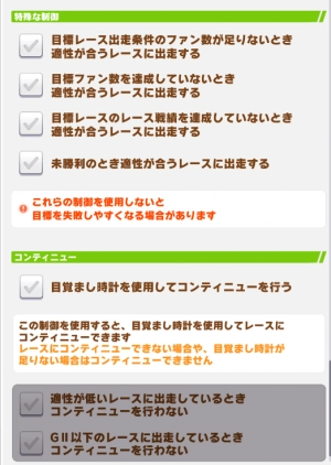 除出道战之前、出道战之后的一个回合和育成目标回合之外,其他时候能够随意选择想要参与的比赛,但是连续3次(包括3次)参赛,不管排名如何都有机会碰到debuff剧情,可能只是减低心情,也有可能获得debuff,也有可能是前面两者都有再加上减少一大堆属性
