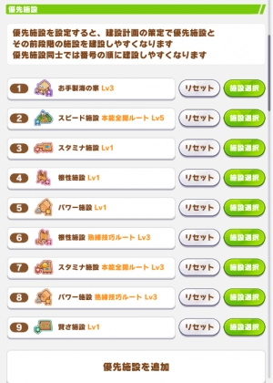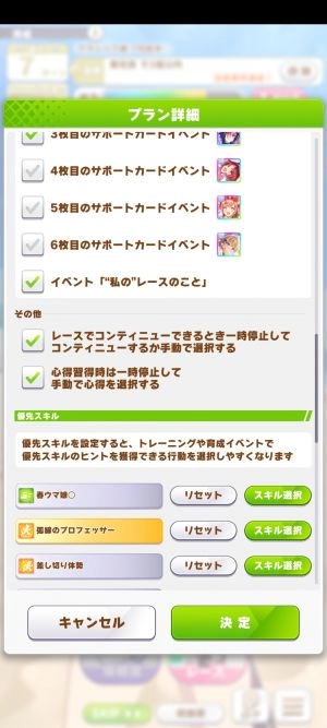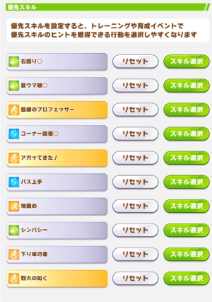 优先技能最多设置十个,育成时若某个指令能获得优先技能,则会优先进行该指令。可以帮助AI识别支援卡选项,比如加入金技能弧线教授则AI会选杏目SSR金技能的下选项。